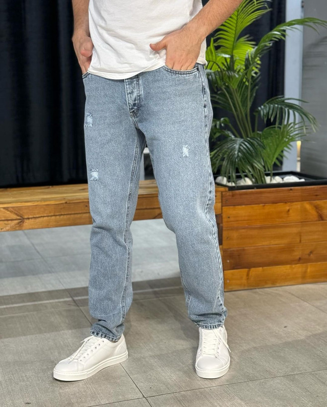 شلوار جین مام فیت مردانه رنگ آبی یخی سیر